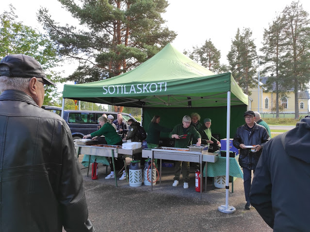 Aluksi näytti siltä, että väkeä ei paljoa tulisi paikalle, mutta kun yhteiskyyditykset (5 linja-autoa) saapui paikalle, alkoi kenttä täyttymään. Tilaisuus siis alkoi klo 16.30 jolloin seurakuntatalon pihassa nautittiin makkaraa perunasalaatilla ja munkkikahvit!